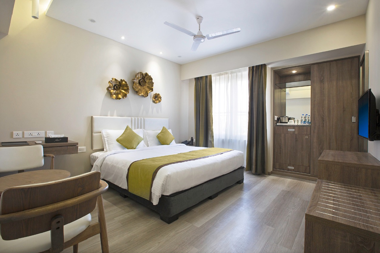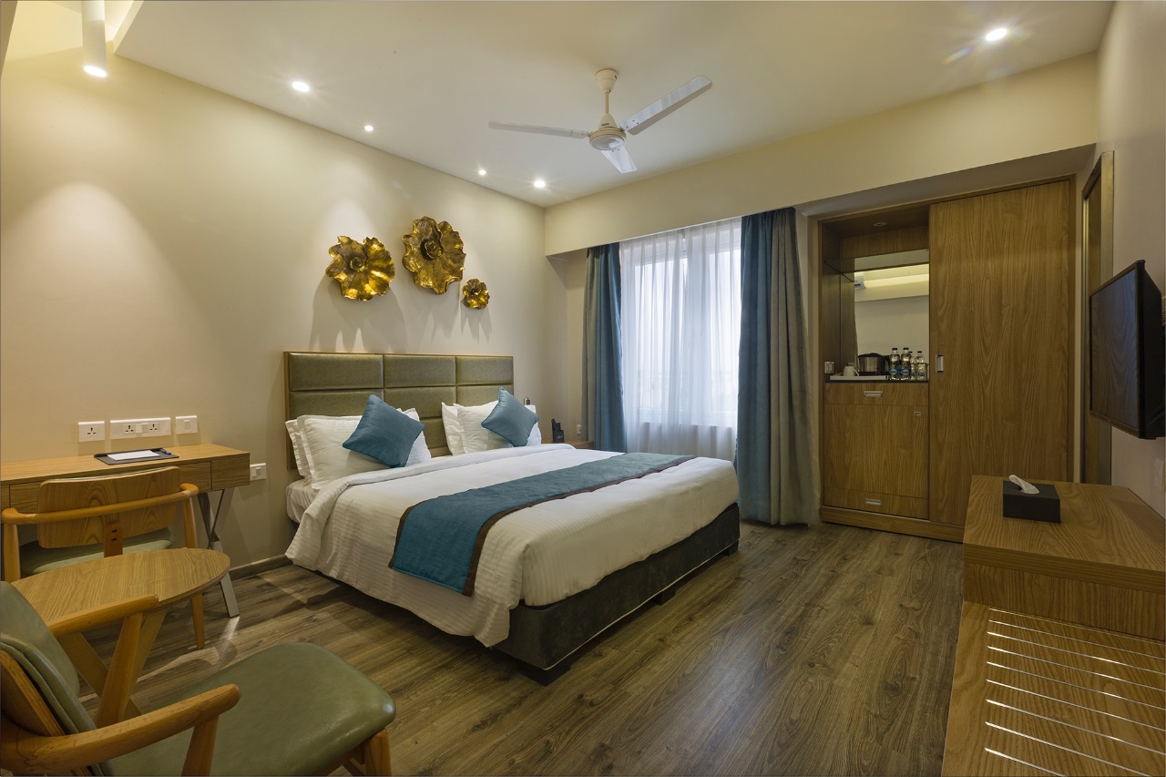 Floressa Residence offers a well-appointed stay with two bed Rooms ideal for both short and long-term visits. Each bedroom features a king-size bed, an LED TV with major prime channels, complimentary water bottles, a mini fridge, a multi-utility kettle, and an electronic safety locker. Guests can enjoy free high-speed Wi-Fi for up to 10 devices and access to 24-hour purified hot and cold drinking water. The living room is designed for comfort, with a second LED TV, a 3+2 seater luxury couch, center table, side table, and a dining table. Balcony access is available on request. The suite also features a fully functional kitchenette equipped with an induction stove, microwave oven, refrigerator, electric chimney, and a convenient breakfast table unit ideal for extended stays.